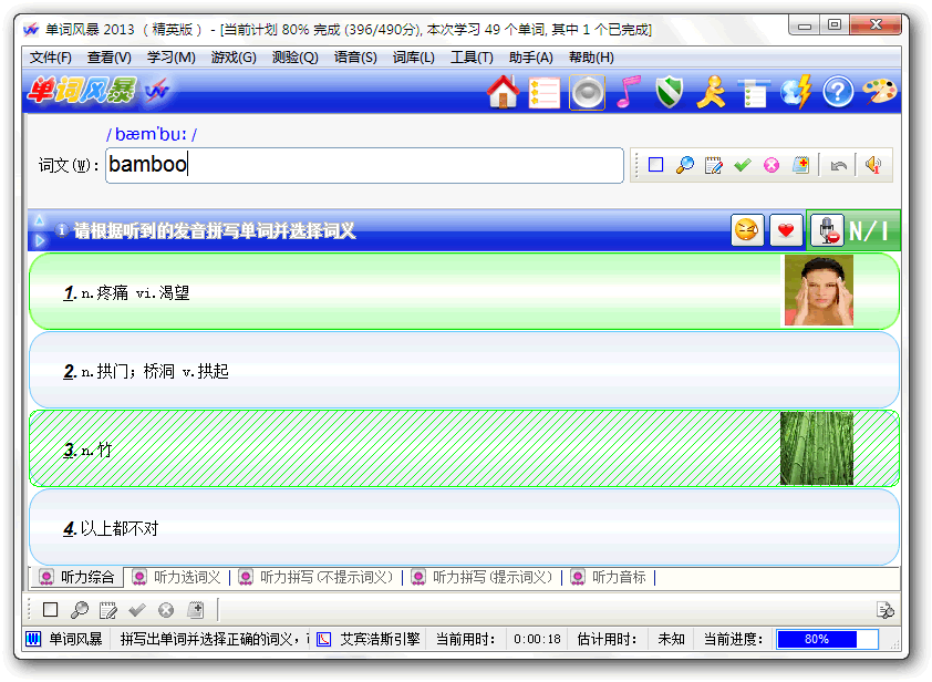 单词风暴之听力风暴(听力综合模块):听到朗读的单词后,拼写单词并选择正确的词义;