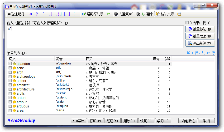 点击“标记单词”按钮将这些单词标记,并将这些单词显示在列表中