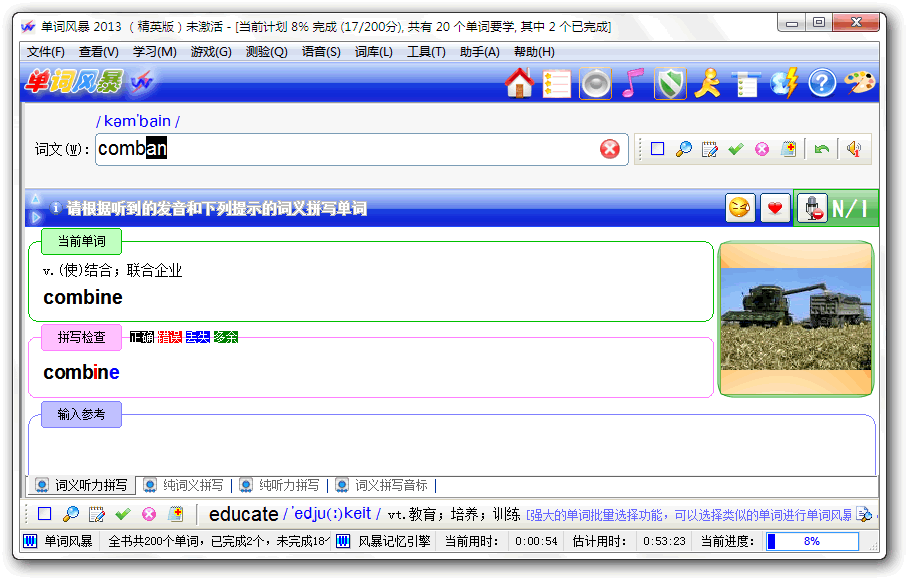 出错时提示拼写检查,并同步查找当前输入的单词,需改正错误后才能继续