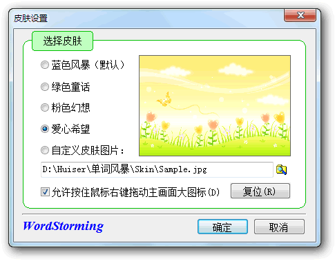 看我七十二变——丰富的界面效果和自定义皮肤功能博客介绍:单词风暴——最漂亮的背单词软件,美丽换肤功能看我72变!单词风暴里可以随意更换程序背景和配色方案,起到了美化和保护视力的效果。看着自己精心定义的界面,背单词时的心情是否也好多了呢? 从主画面的右上方点击“更换皮肤背景”